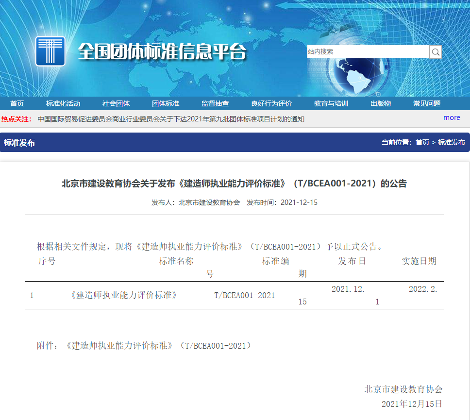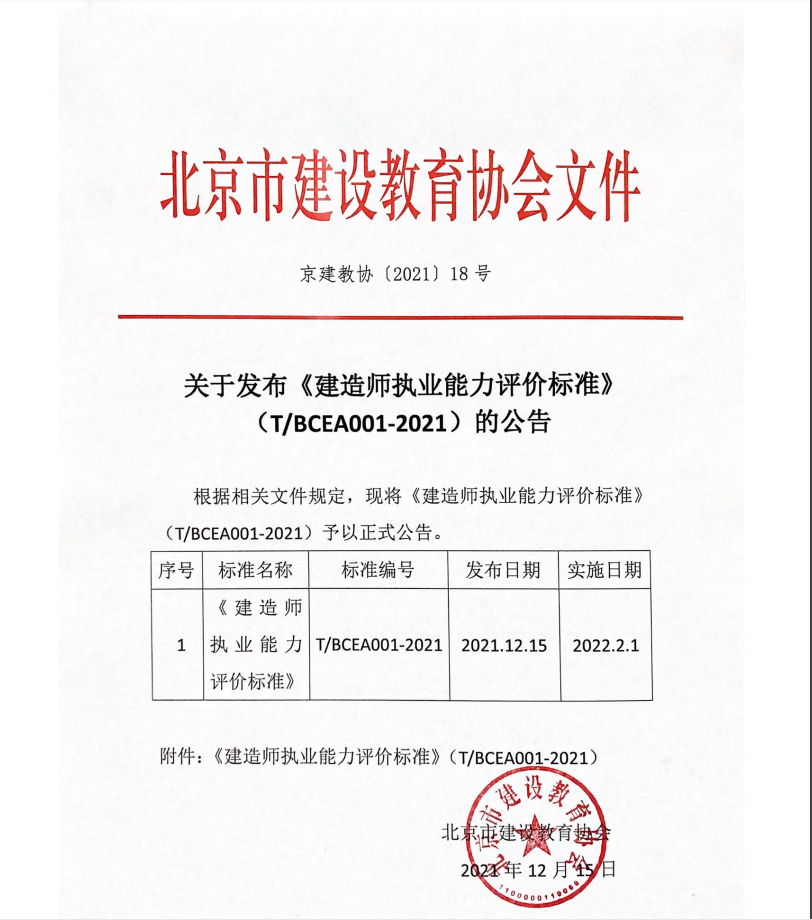 2021年12月15日,北京市建設(shè)教育協(xié)會發(fā)布了《建造師執(zhí)業(yè)能力評價(jià)標(biāo)準(zhǔn)》(T/BCEA001-2021)公告。該標(biāo)準(zhǔn)將在2022年2月1日起開始實(shí)施。 標(biāo)準(zhǔn)可作為管理機(jī)構(gòu)、用人單位對建造師管理及聘用的依據(jù),并可作為建造師行業(yè)能力發(fā)展標(biāo)準(zhǔn)的指引,助力工程建筑企業(yè)進(jìn)行數(shù)字化轉(zhuǎn)型升級。