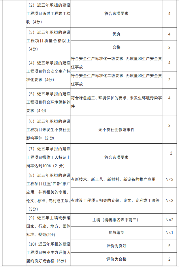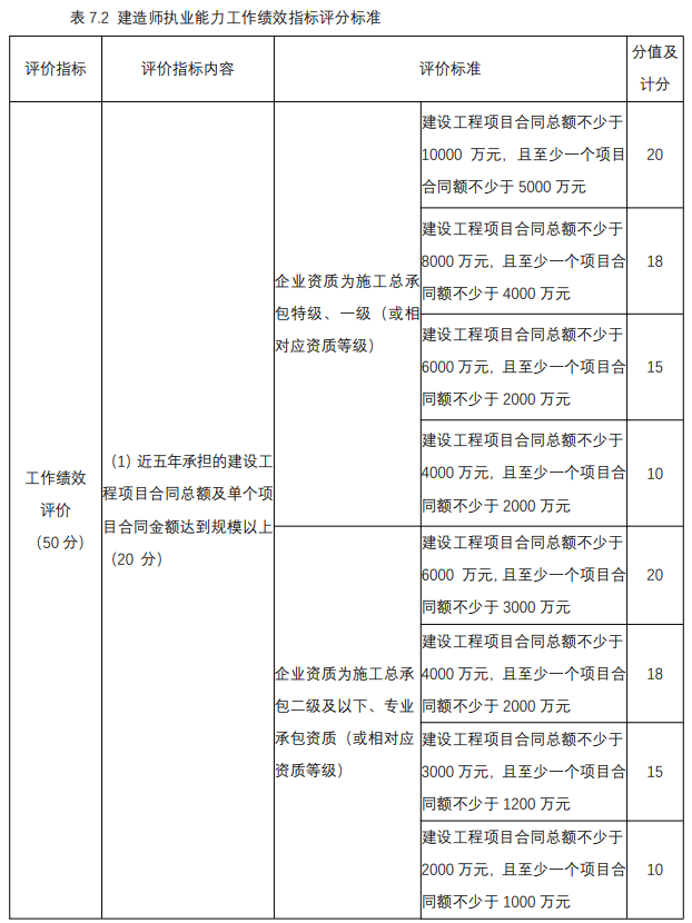 建造師執(zhí)業(yè)能力資格資歷指標(biāo)按下表中的標(biāo)準(zhǔn)評分。