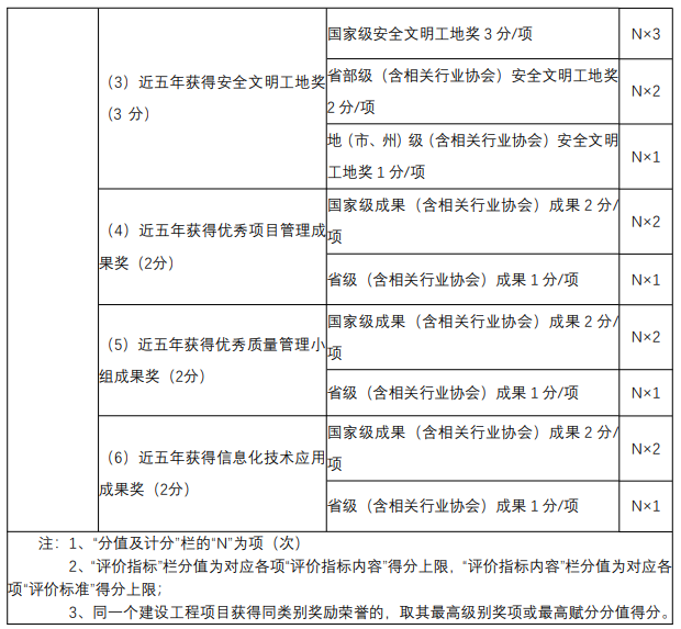 近五年獲得的榮譽(yù)獎勵評價(jià)指標(biāo)內(nèi)容包括:①工程建設(shè)相關(guān)個人獎勵;②工程質(zhì)量獎;③安全文明工地獎;④優(yōu)秀項(xiàng)目管理成果獎;⑤優(yōu)秀質(zhì)量管理小組成果獎;⑥信息化技術(shù)應(yīng)用成果獎。